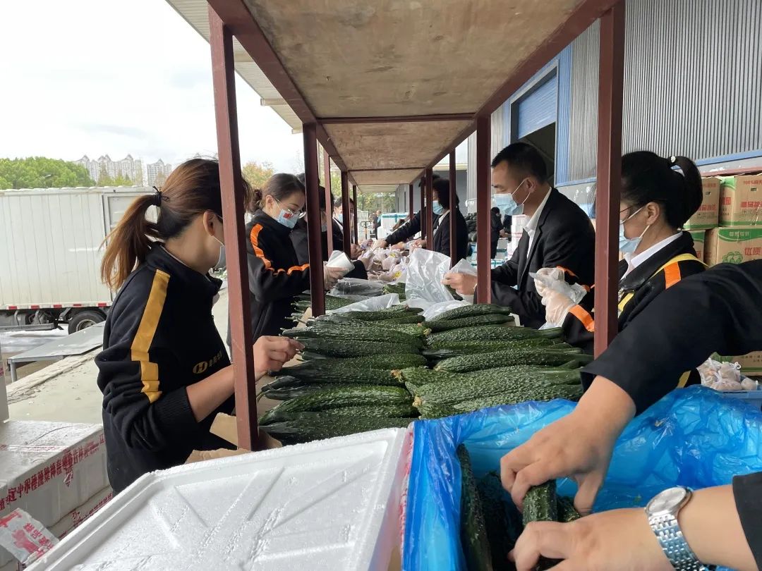 在阜陽華聯(lián)物流園內(nèi),各部門緊急抽調(diào)來的幾十名員工連續(xù)工作10個小時頂著寒風(fēng)把剛采摘的土豆、冬瓜、青包菜、西蘭花等蔬菜進行分揀、裝袋、打包、裝車,整個場面緊張有序。一袋袋滿溢著愛心的蔬菜包為猛降19°的阜城增添了一抹暖意與溫情。