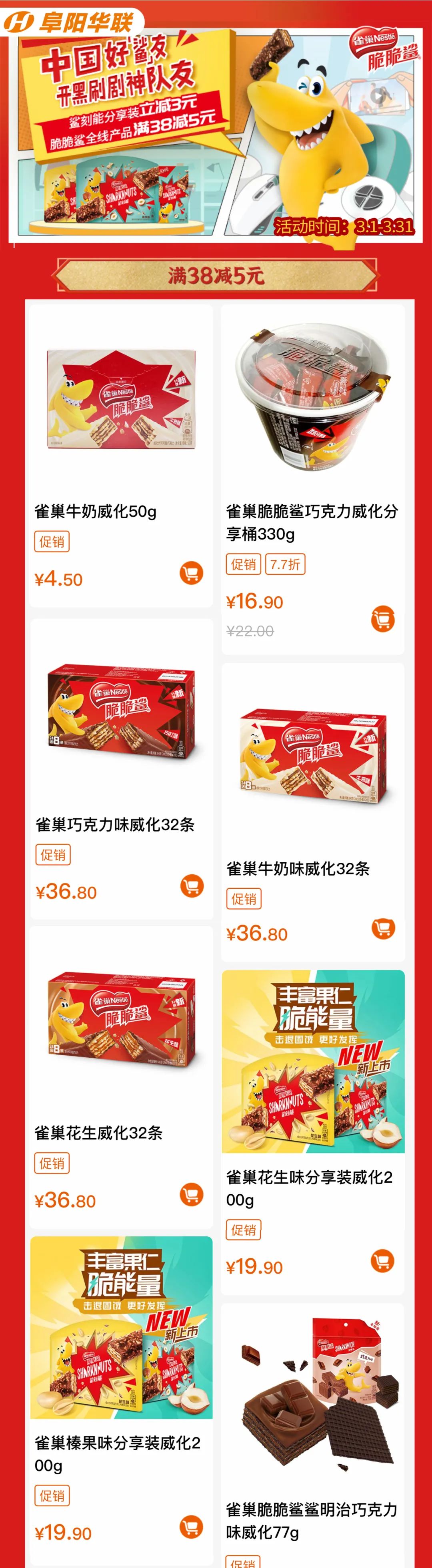 阜陽華聯(lián)優(yōu)選 | 雀巢脆脆鯊全線產(chǎn)品滿38立減5